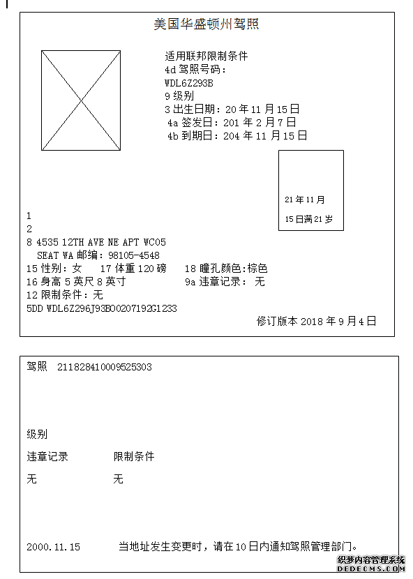 美國的駕照是分橫版和豎版的,我現在展示的就是豎版的,豎版適用于未年滿21周歲的駕駛者使用的。這個模板很珍貴。